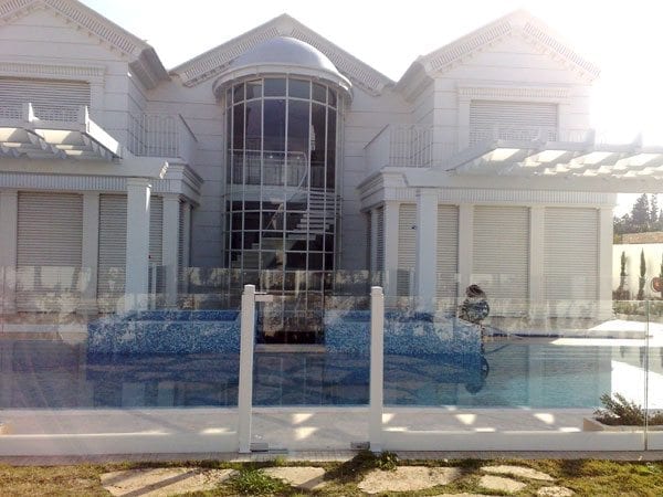 מעקה זכוכית שתול לבריכה- דלתות כניסה לשטח הבריכה מזכוכית אקסטרה קליר מחוסמת.