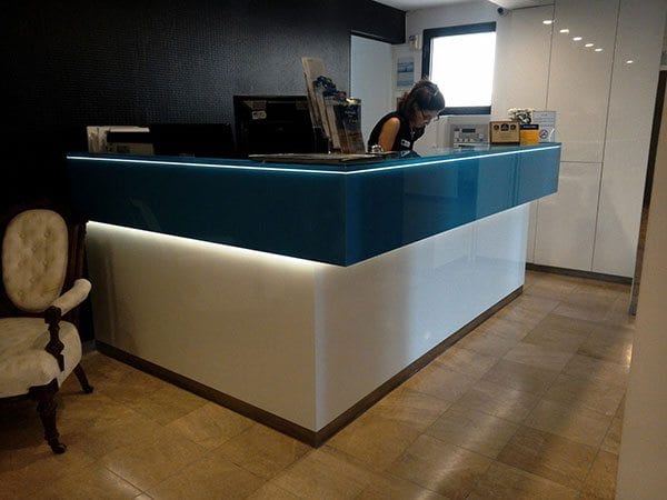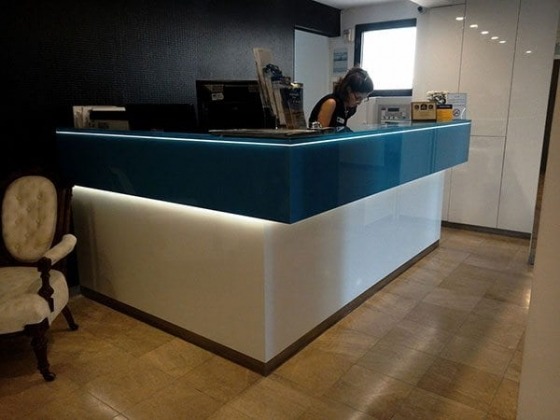דלפק מצופה בזכוכית עם תאורת לד אחורית.