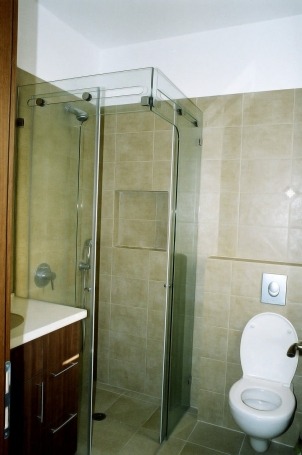 מקלחון פינתי (הזזה בחריץ) – זכוכית שקופה מחוסמת בעובי 8 מ”מ.