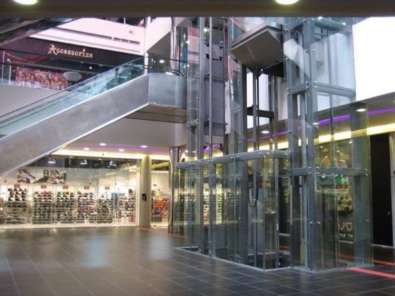 פיר מעליות פנימי- סינמה סיטי ראשון לציון. הזכוכית רבודה ומחוסמת לפי תקן.